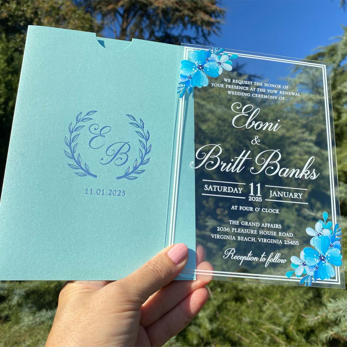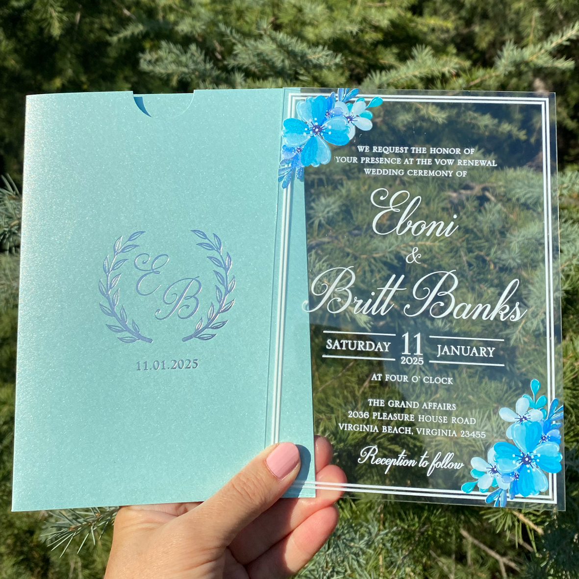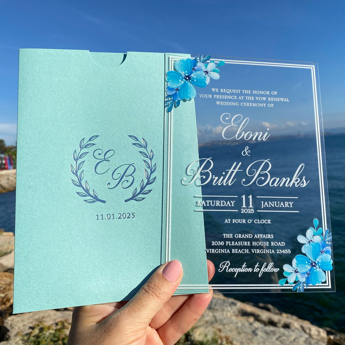 Blue floral acrylic wedding invitation, UV printed acrylic invitation. Floral Invitation Card, Turquoise envelope with silver foil print